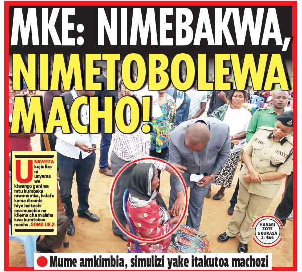 “Baadaye nikachukuliwa kupelekwa hospitali ya Kolandoto kwa ajili ya kupatiwa matibabu, madaktari wakasema macho hayawezi kuona tena,” alisema Fatuma wakati akitoa ushuhuda wake mbele ya watu waliokusanyika viwanjani hapo. Wakati mwingine ni kweli dunia haina huruma; mtu kabakwa, katobolewa macho lakini mume ambaye ungetaraji angekuwa upande wake naye anatajwa kujitenga naye.